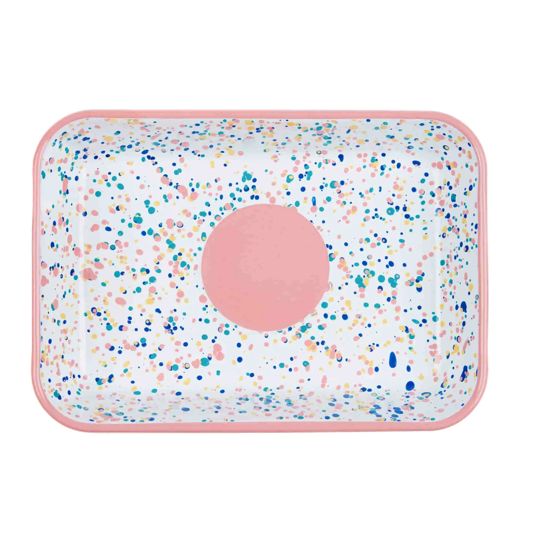This pink dot roasting dish is as versatile as it is beautiful. You can use it on the hob, in the oven and as a serving dish for all your favourite baked creations. It features colourful paint splatters and a candyfloss pink rim and central dot design. Use it for cheesy pasta bakes, roasted root vegetables and one-pan traybakes.