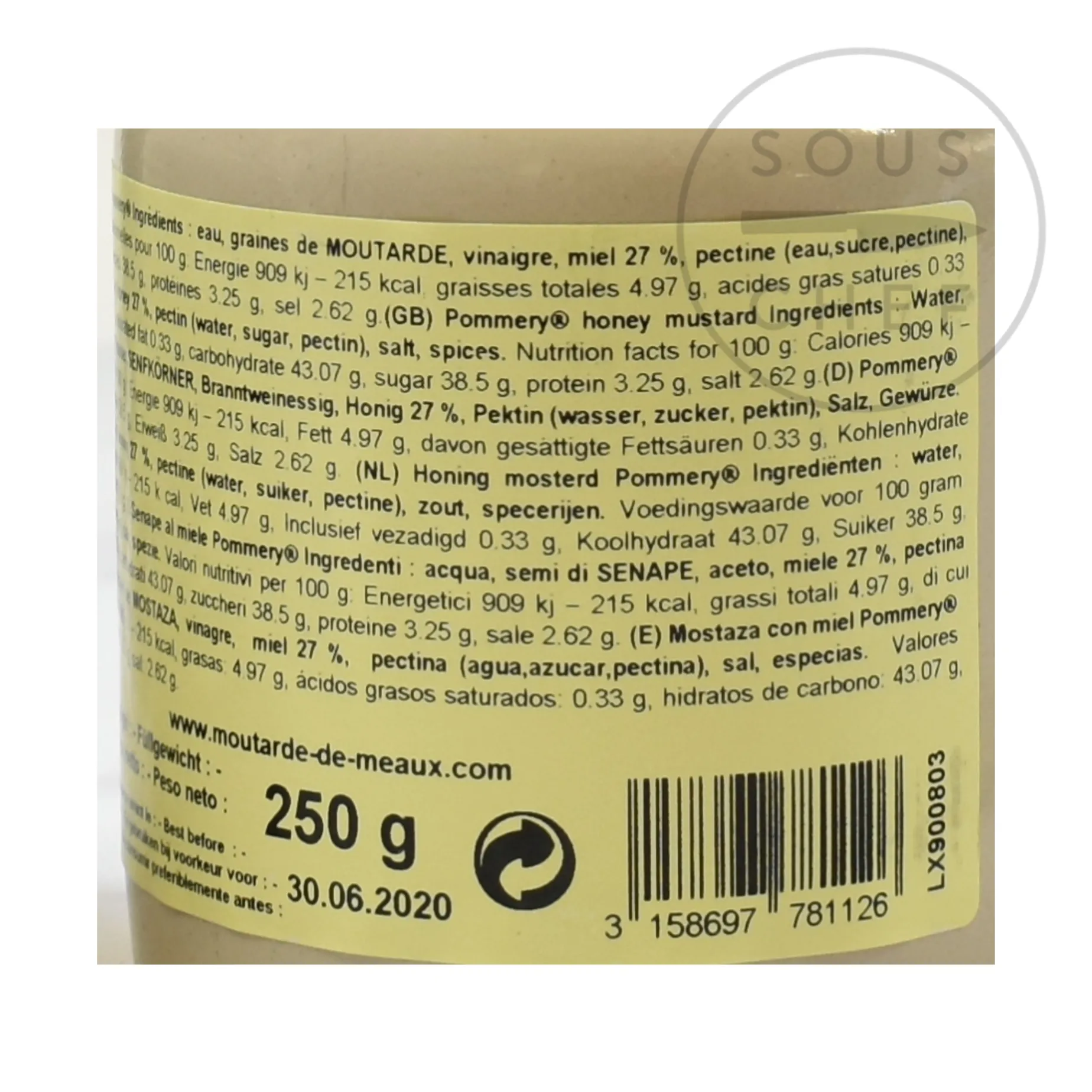 Product formulations and details may change. For the latest ingredients and allergen information always check product packaging prior to consumption. Ingredients: water, mustard seeds, vinegar, honey (27%), pectin vinegar, salt, spices. Contains allergens: mustard.