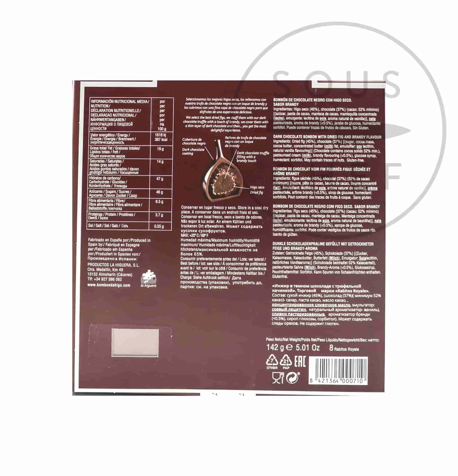 Rabitos royale chocolate figs are a cult Spanish dinner treat. Enjoy rabitos royale chocolate figs as an indulgent accompaniment to a strong coffee or evening liqueur. The slightly chewy figs are filled with a velvety chocolate and brandy ganache, and coated in rich, smooth dark chocolate for a luxurious treat. The figs are a small, sweet variety called Pajarero, a speciality of the Extremadura region of Spain.