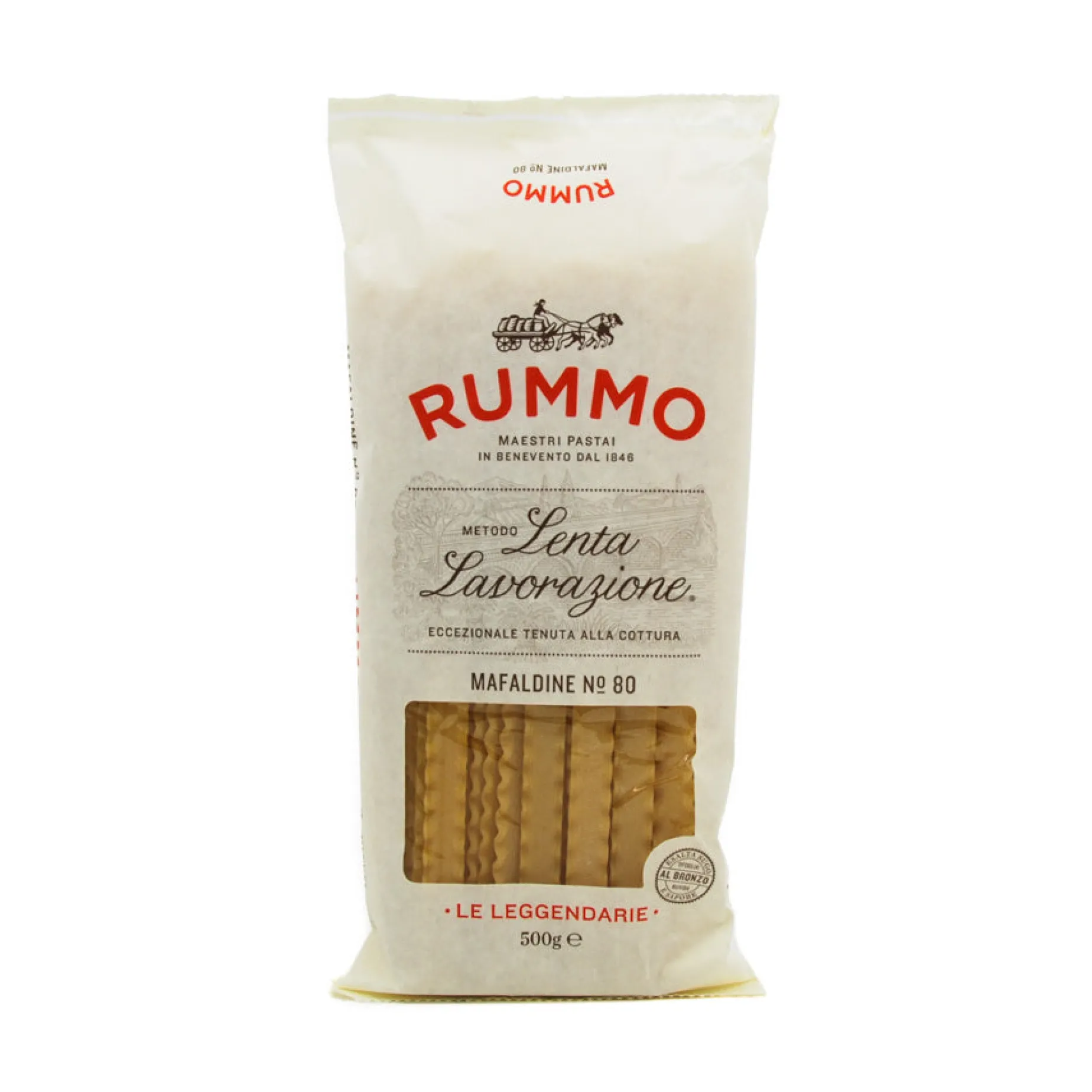 Rummo mafaldine pasta no. 80 is long wide strips of pasta with a frilly edge. Try the mafaldine pasta with a slow-braised rich ragu, or with pan-fried wild mushrooms and cream. Rummo mafaldine pasta cooks in 8 minutes. Before cooking the mafaldine pasta is 26cm long and 1.4cm wide.