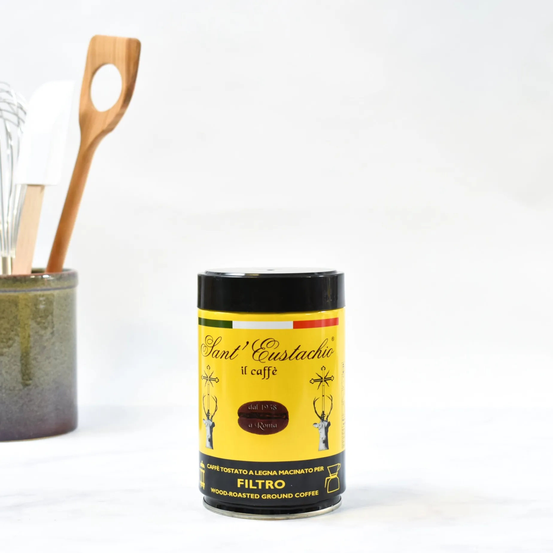 Use the Sant’Eustachio coffee blend ground for filters to make every coffee extra special. This secret blend of 100% Arabica, wood roasted coffee beans is particularly desirable for making the perfect Italian espresso or cappuccino. The medium-large size of the coffee grounds is ideal for coffee filters, percolators or cafetières.