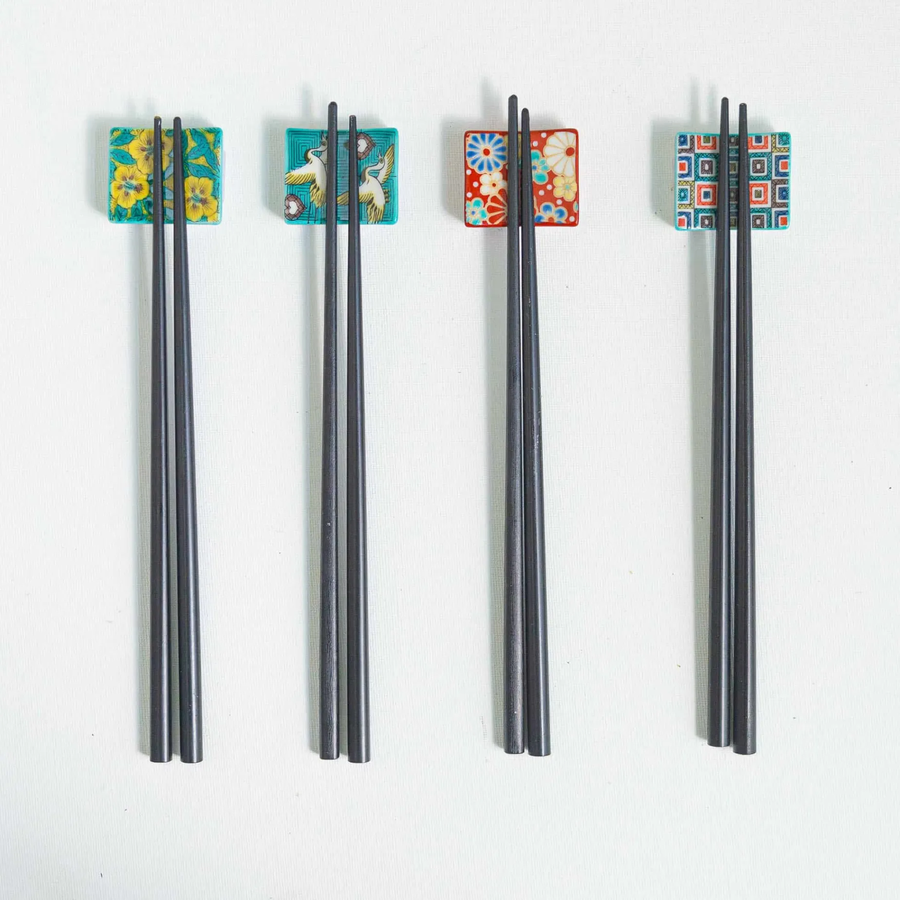 The Aoi porcelain chopsticks rest is decorated with a delicate floral design in shades of blue and yellow. Made in Japan, the small square rest is a stylish and practical way to keep your table clean while you’re enjoying your meal. Simply place your chopsticks on the rest while you’re sipping sake or reaching for the last dumpling. Matching chopsticks are available to create an eye-catching dining set.