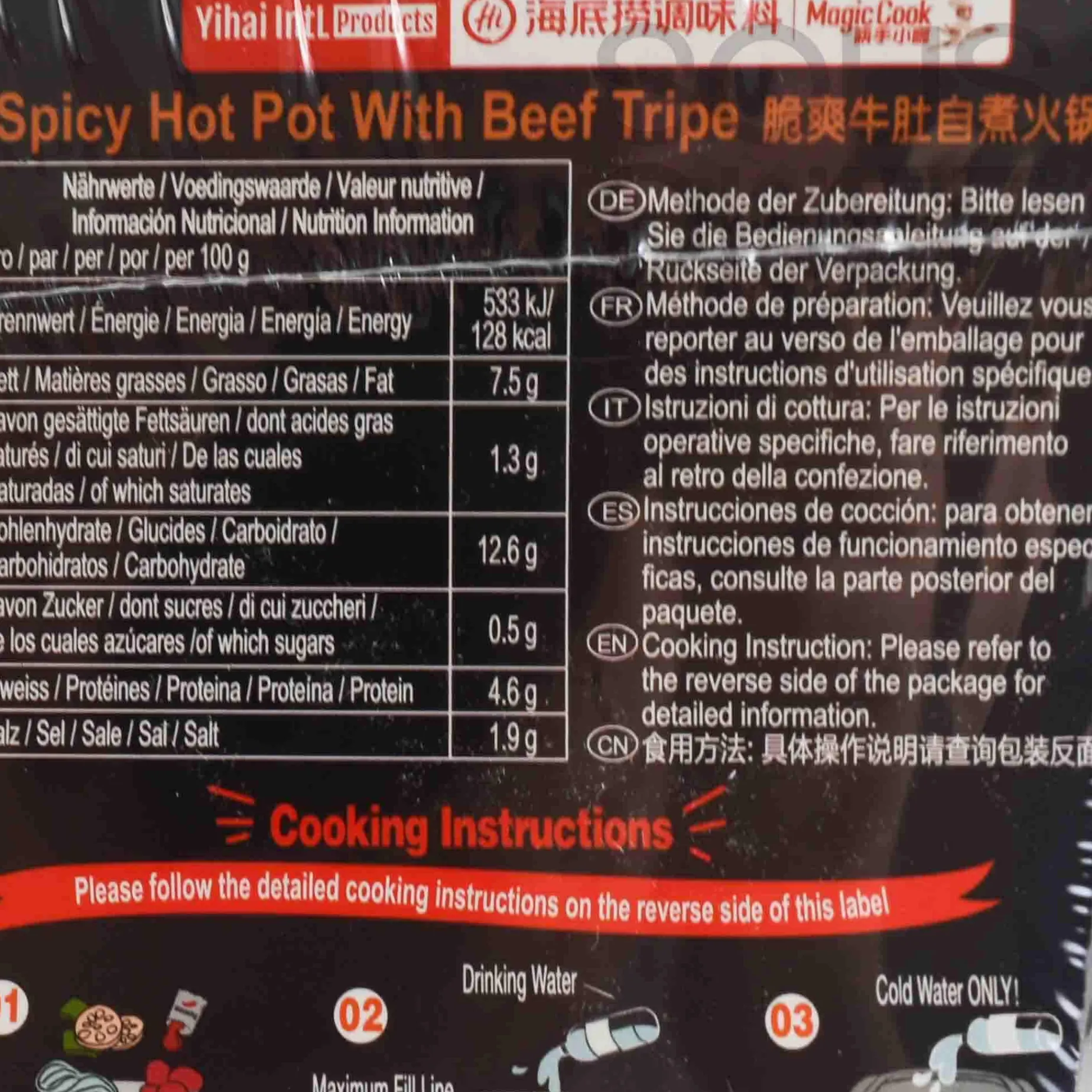 Product formulations and details may change. For the latest ingredients and allergen information always check product packaging prior to consumption. Ingredients: Spicy flavour hot pot seasoning(65g):soybean oil, broad bean paste,(chili pepper, broad bean, water, salt, wheat flour), chili pepper 1.7%, salt, seasoning[water, wheat flour, salt,maltodextrin, dextrose, sugar, thickener(e1442, e412), flavouring,ginger ], ginger, garlic, sugar, spices, green onion, grain spirit, fermented soybean (soybean, water, salt, wheat flour), flavour enhancer(e621, e635),sichuan pepper, yeast extract, flavouring, colour(e160c). pickled vegetables(200g): salted lotus roots[lotus root, salt, preservative (e223/sulphites)],potato, jew’s ear, salted kelp(kelp, salt), salted bamboo shoots [bamboo shoots, salt, preservative (e223/sulphites)], water, salt, acidity regulator (e330), flavour enhancer(e621, e635), preservative(e202); cured beef tripe: beef tripe17%, soybean sauce (soybean, water, salt, wheat flour, colour(e150c), acidity regulator (e260,e270)], sugar, salt, spices, water, orange peel, seasoned wine (water, rice, wheat). vermicelli: peas, mung beans, water