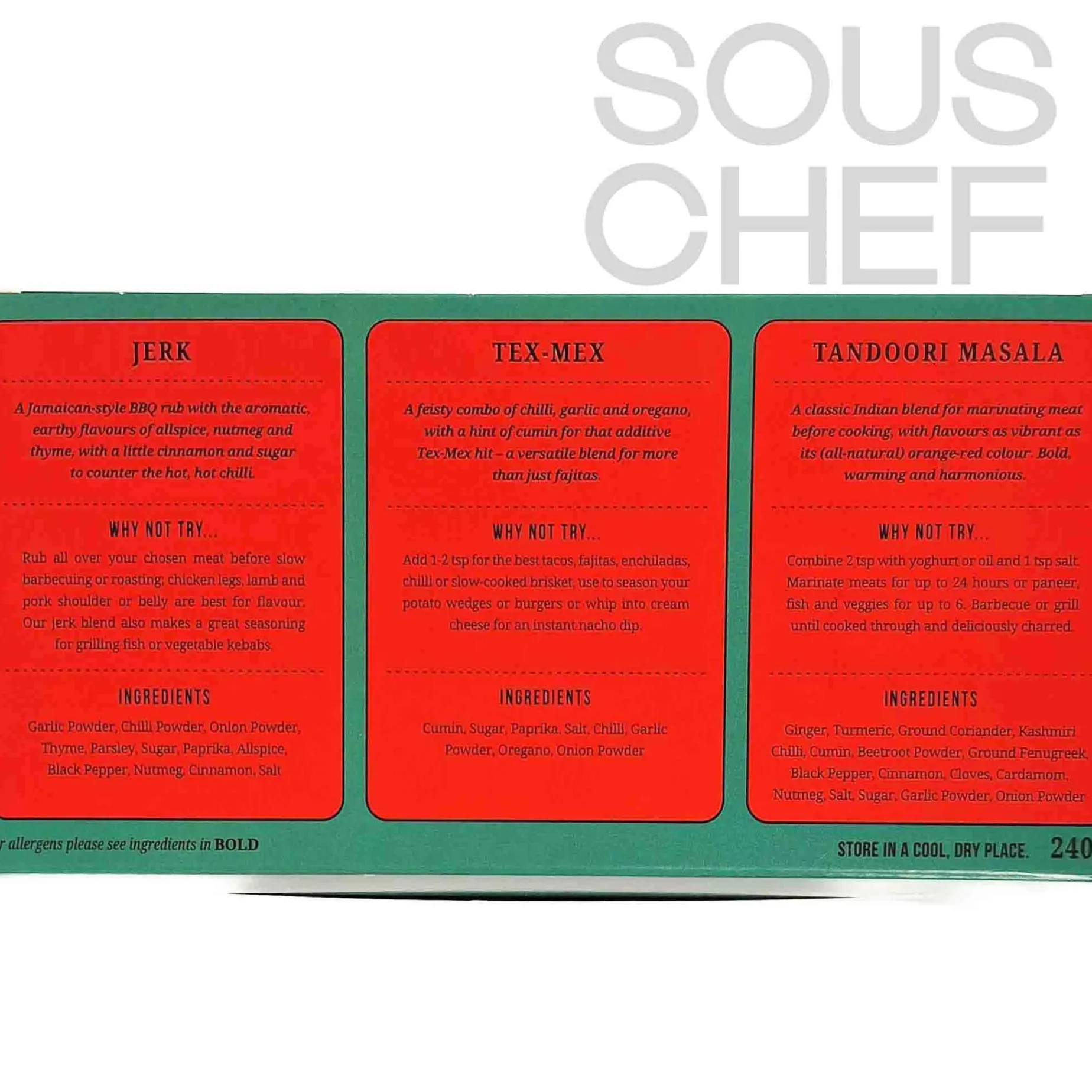 Take your taste buds on a world tour with the Spice Kitchen BBQ blend trio. These spice blends are inspired by Indian, Caribbean and Tex-Mex flavours. Presented in colourful tins, this spice trio is a great gift for adventurous cooks.