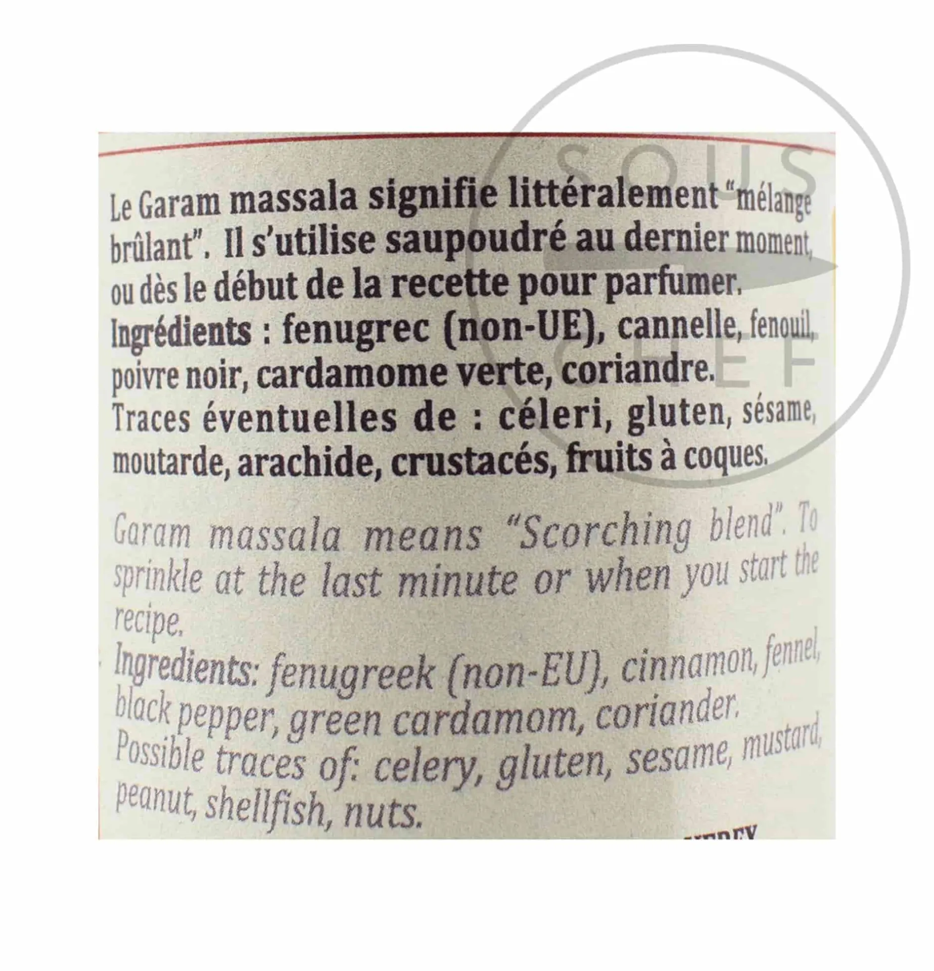 Terre Exotique’s garam masala is a Northern Indian spice blend, used alongside onions as the base for curries. In Hindi, garam translates as spicy, and masala translates as spice mix. This key spice mixture is made with fenugreek, cinnamon, fennel, black pepper, green cardamom and coriander – it has a warmth, slight smokiness and peppery kick.