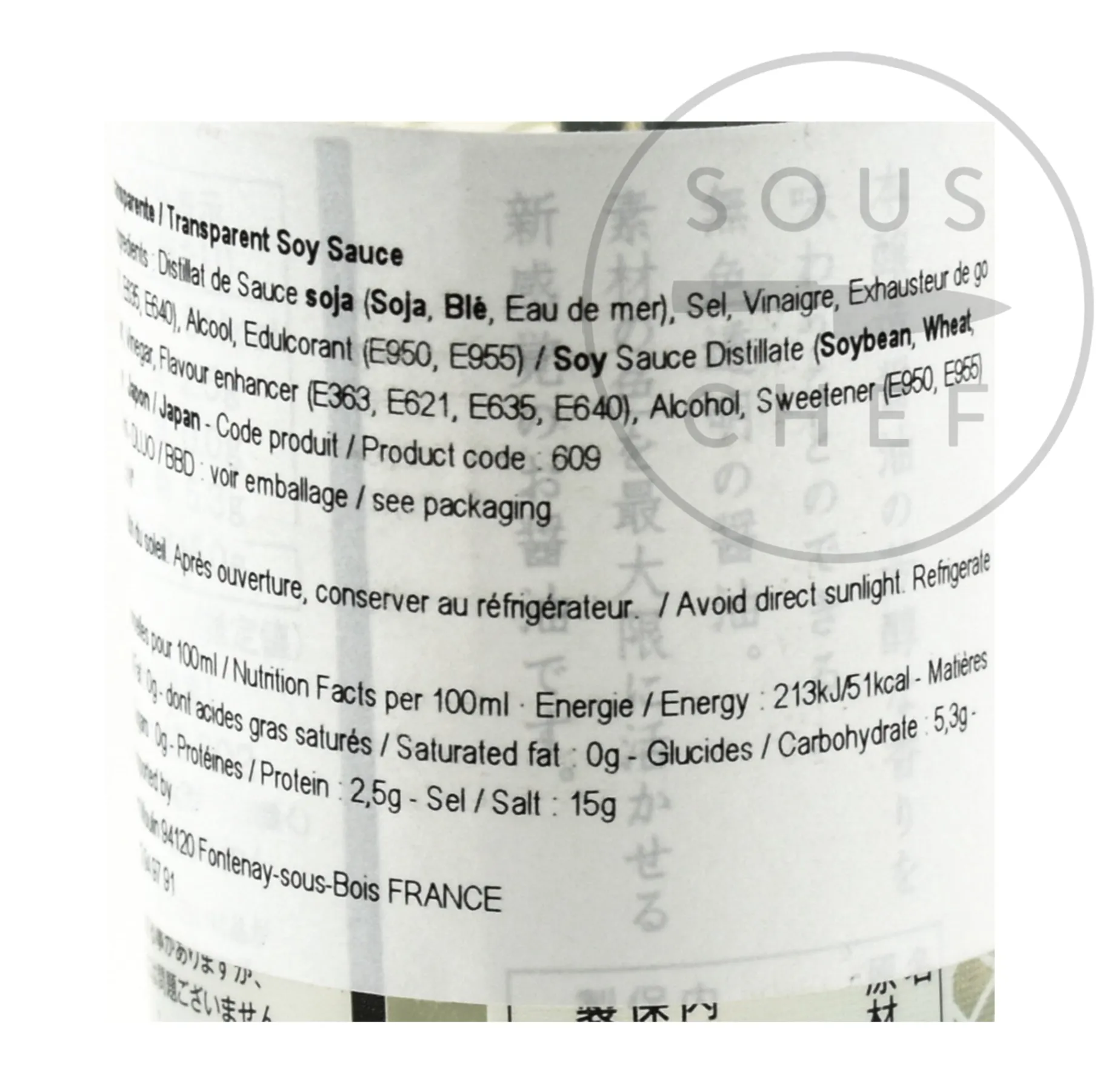 Transparent soy sauce gives your food an umami depth of flavour, while keeping the original colour of the ingredients. Unlike dark soy sauces, this version has been made from distilled soy sauce giving it the transparent appearance. With a deep, rounded flavour, this soy sauce is perfect for seasoning seafood carpaccio and sushi.